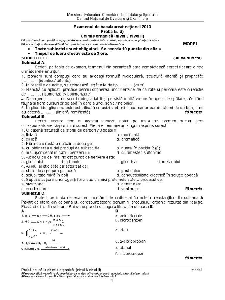 Modele De Subiecte 2015 Chimie Organica Filiera Tehnologica