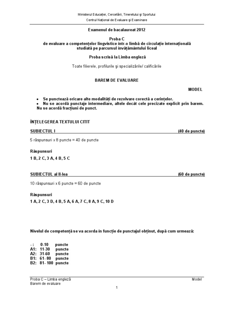 Evaluarea competenţelor lingvistice într o limbă de circulaţie internaţională studiată pe parcursul învăţământului liceal se realizează prin proba c a examenului de bacalaureat. Vineri absolventii de liceu au sustinut. Ministerul educației a publicat pe edu ro alături de modelele de subiecte pentru proba orală de limba engleză și un barem de corectare. Ministerul educatiei a publicat pe site ul oficial edu ro baremele si subiectele integrale de la ultimul examen al bacalaureatului 2012 sesiunea de toamna.