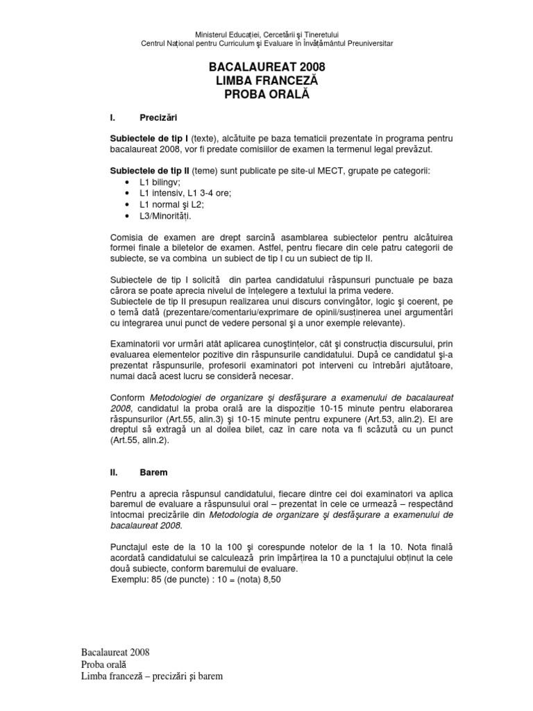 B Bacalaureat 2008 Limba Franceza Precizari Si Barem Model Si
