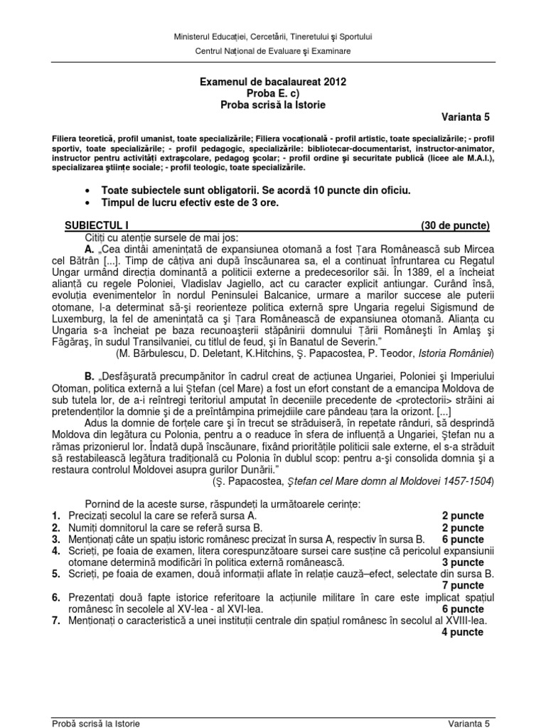 Subiectul La Istorie Bacalaureat 2012