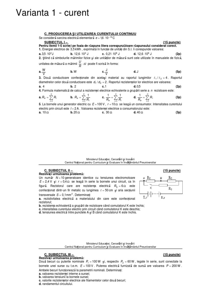 Varianta 100 2009 Fizica Producerea Si Utilizarea Curentului