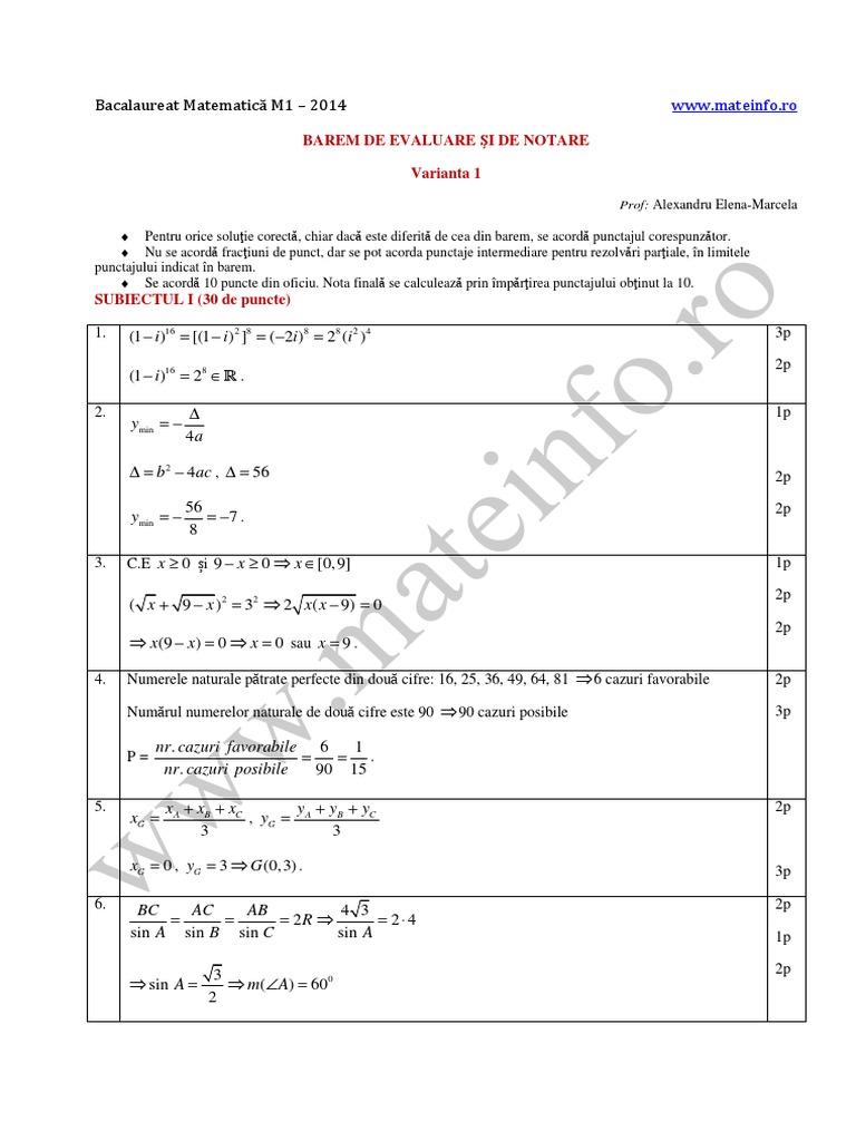 Bareme Si Solutii Culegere Online Bac Matematica Mate Info