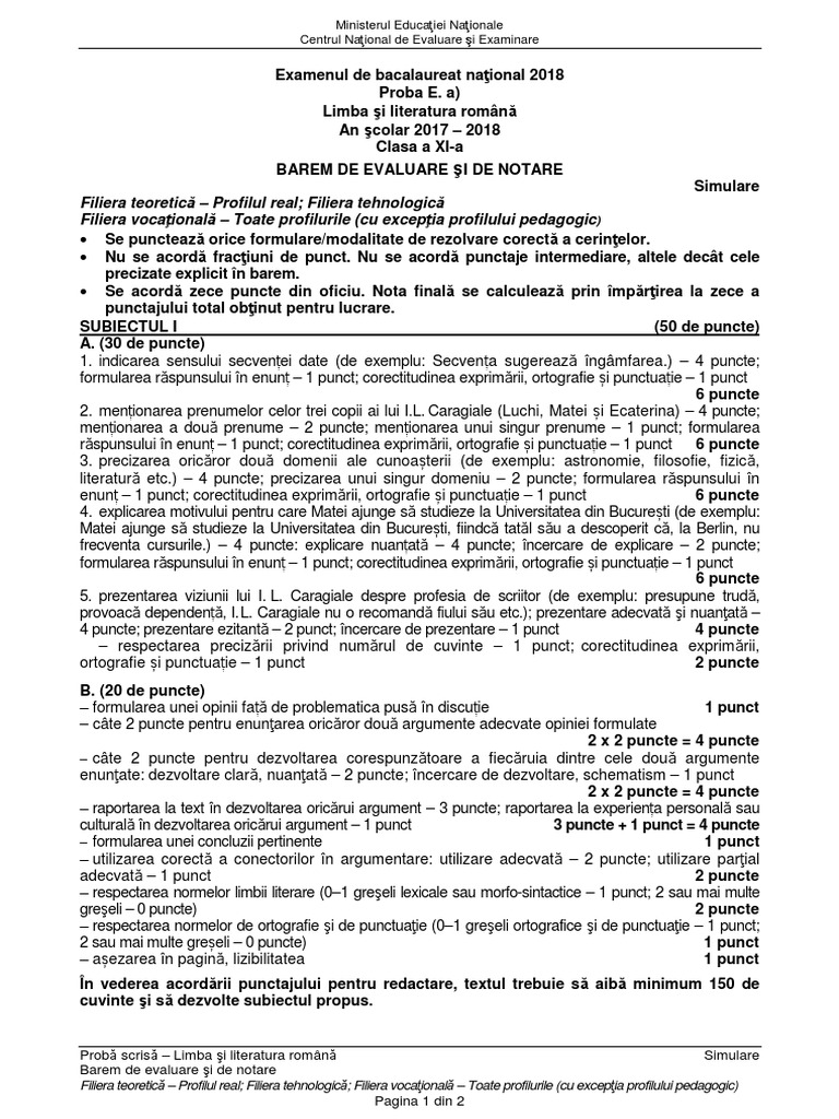 Bareme Edu Bac 2018 Limba Romana Proba E A 25 06 2018 Vezi